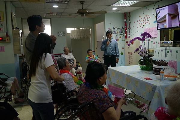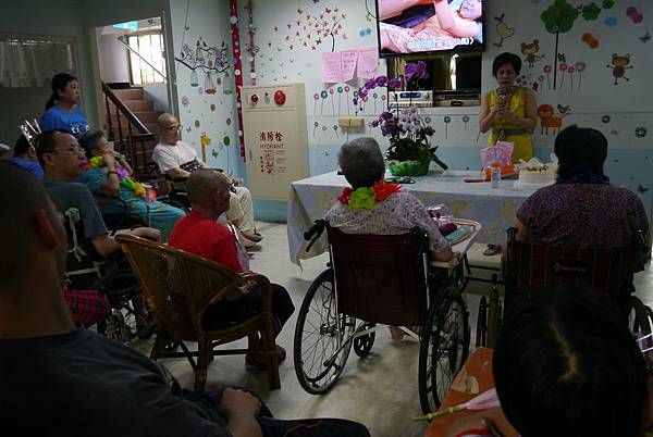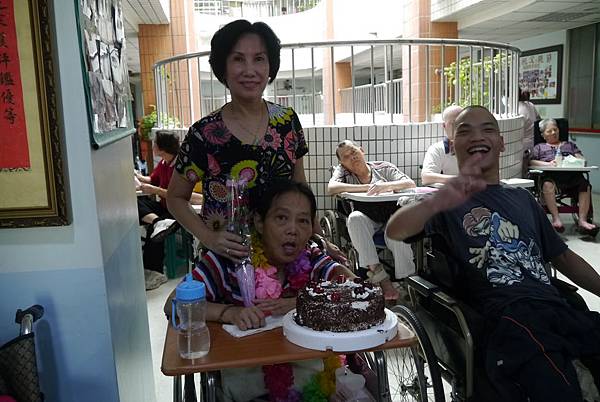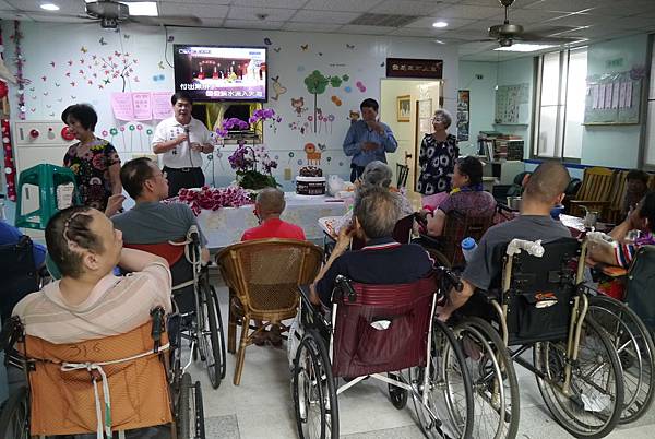 五月份的壽星有簡金玉、鍾振、林金玉、楊麗珠、林周月嬌、王郭秀美、等六位壽星,來到現場的幾位壽星脖子掛上花圈,高高興興的坐在輪椅排一排,前面擺著生日蛋糕,大家以國、台語唱「生日快樂」,柷福上帝能幫她們從輪椅上站起來,生命變得更剛強。