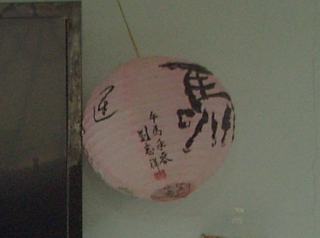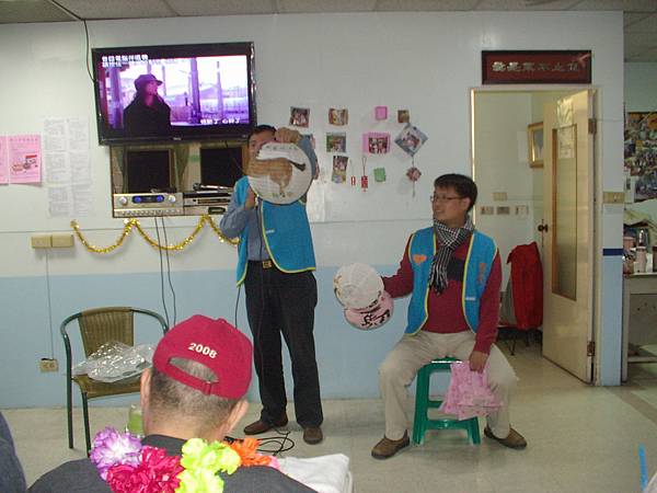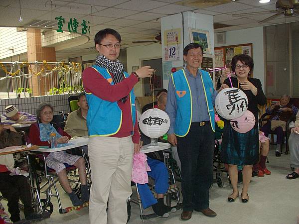 劉隊長又說:「元宵節食圓〈湯圓〉,予恁〈lìn〉大賺錢;看花燈,予恁好運一層一層,臆謎猜,予恁笑咍咍。」隨即拿出自己彩繪的一大兩小燈籠,一大一小寫著一個《象形馬》與畫一隻馬,並書寫《馬年行大運》;另一個小燈籠畫兩條魚戲水,並書寫《年年有餘》讓住民觀賞,最後,將花燈贈送給聖光診所附設護理之家負責人張秀慧,祝聖光「馬年行大運,年年有餘」。