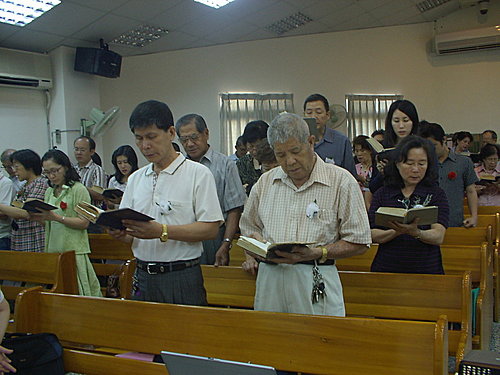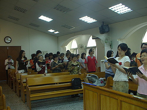約莫十多分的路程,轉入鳳山市最短的路──仁愛路,有人打趣說:「我們走短路,離天國近了!」又是一陣笑聲。抵達東門教會,因我不是教友,第一次進入東門教會,就被會場的和樂溫馨氛圍震撼住,感動不已。東門教會主日禮拜,上午九點四十分開始,主禮葉光志牧師,司會陳利建執事;禮拜程序首先是靜候上帝的話:宣召,與敬拜讚美;然後聖詩高唱:「美妙主耶穌」、「親像鹿欣慕溪水」、「耶穌,全地的主」,在司琴邱秀文姊妹鋼琴伴奏下,耳邊流洩著陣陣傳來的合唱,歌聲悠揚,帶動了整場的氣氛。接下來的項目是新的誡命、啟應文與祈禱。