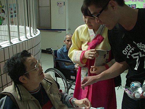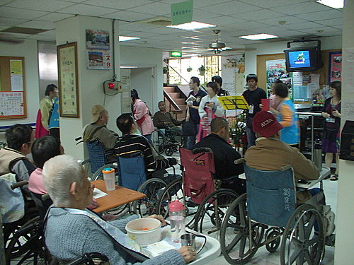 二月七日,下午三點半,韓國三一教會一群年輕人訪問聖光謢理之家,院長盧明吉與院長夫人張秀慧帶領志工與住民列隊鼓掌歡迎,韓國三一教會表演唱歌、帶動唱、薩克風演奏與跟每位住民祈禱、分送糖果,溢滿溫馨與喜樂。