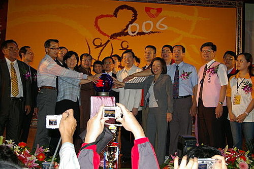 中午在餐廳用完餐,略作休憩,大夥即搭車前往成功大學中正堂,參加全國志工大會師,全國廿五縣市志工隊,紛紛準備響亮的隊呼進場,我門在高雄縣隊牌與隊旗引導下,每人手持兩個由寶特瓶內裝黃豆,外包紅、藍、綠色金泊祇的加油棒,一邊敲響加油棒,一邊喊著「高雄縣福利縣,健康快樂在高縣!」進場,贏得熱烈的掌聲,新竹縣隊則在身上別上發光小燈泡吸引目光,有些則是製作三角旗幟、看板來藉機宣傳,台中市隊員更外套上別著一包太陽餅,象徵在地特色,高雄市隊每人披上「志工家族」紅色綵帶,好像民意代表候選人,引來「凍蒜」聲不絕於耳,台中縣代表更以男扮女裝穿比基尼、女生著日本和服進場,引發現場笑聲不斷。