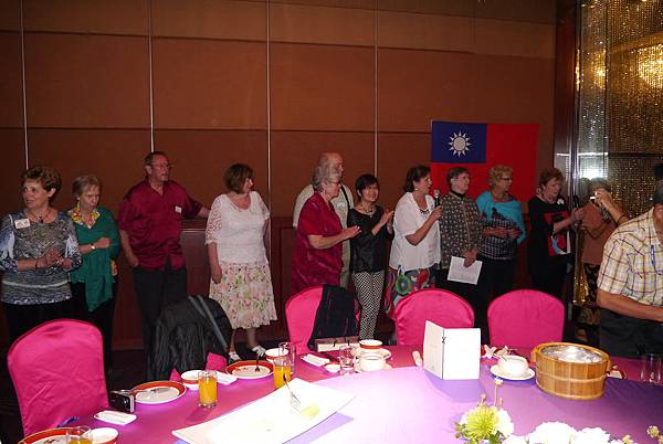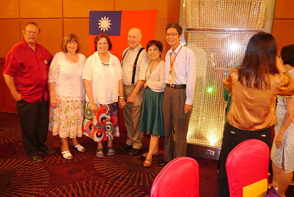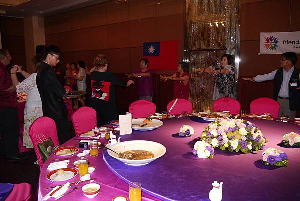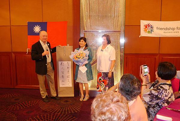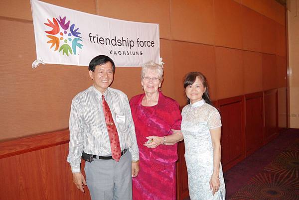 晚間六點半,在高雄漢神巨蛋九樓金鶴餐廳舉辦歡送會,FFI Kaohsiung會長兼ED Kathy說:「我們這次舉辦美、澳、印國際友誼團《發現台灣》訪問交流,相信帶給大家有快樂的記憶與美好的回憶。」美方ED Ted說:「一個禮拜來,我們玩得很愉快,吃得很快樂,感謝接待家庭熱情的招待。」語畢,掌聲如雷。我方ED Kathy並贈送「賢者虛懷若谷, 仁人習靜如山」墨寶捲軸給Ted,讓他大喜過望,接著Ted夫人Rita贈送一束花給Kathy,得到許許多多的掌聲。