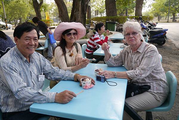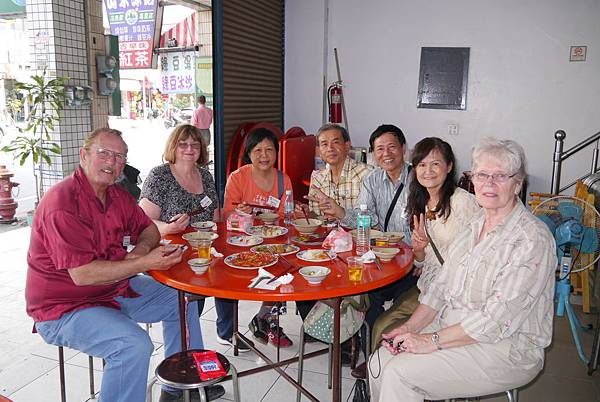 中午,O San〈王正忠〉開車載楊璟蕓〈Beth〉與兩位親善大使汪妮塔(Juanita)與蘿伊德(Lloyd),跟著我開車到美濃吃板條、客家小炒、福菜、溪蝦、花生豆腐、沙拉筍子,品嘗美濃客家菜風味。接著,參觀美濃民俗村吃擂茶與旗山糖廠吃酵母冰淇淋。