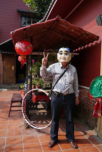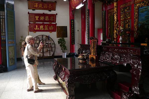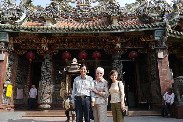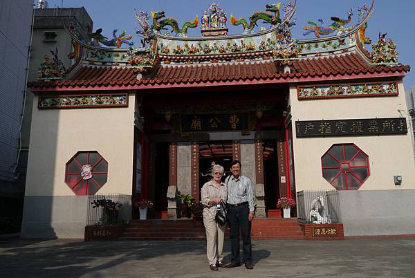 三月二十日上午,我夫妻倆帶親善大使迪樂思〈Delores〉參觀鳳山曹公祠,祠的正殿中掛著清朝咸豐10年由全縣市民所立的『正德厚生』古匾,庭院左側有碑林,曹公祠門前有一排石碑,石碑上保有曹謹的親筆字跡,十分具有歷史意義;進入曹公廟門後為天井,天井加上透明的屋篷使得廟內即使不開燈光線仍然很充足,在天井下還有一道門牆,有畫風不俗的裝飾畫,造型顯得十分特別但古樸,曹公祠的紅側門則配上紅磚砌的台階,古色古香的風味。
