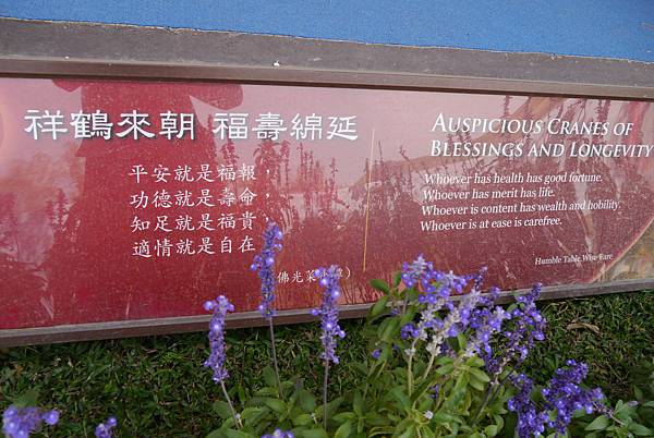 我們在本館參觀楊惠姍琉璃展,然後到本館後方的佛光樓,高十二層,內設有餐廳供信眾飲食、休憩,並有百人圓桌餐廳。佛光樓上方的佛光大佛為佛陀紀念館地標,連基座高一百零八公尺,使用銅鐵重達一千七百八十噸,是世界上最高、最大之銅鑄坐佛,我們景仰良久,並拍照留念。